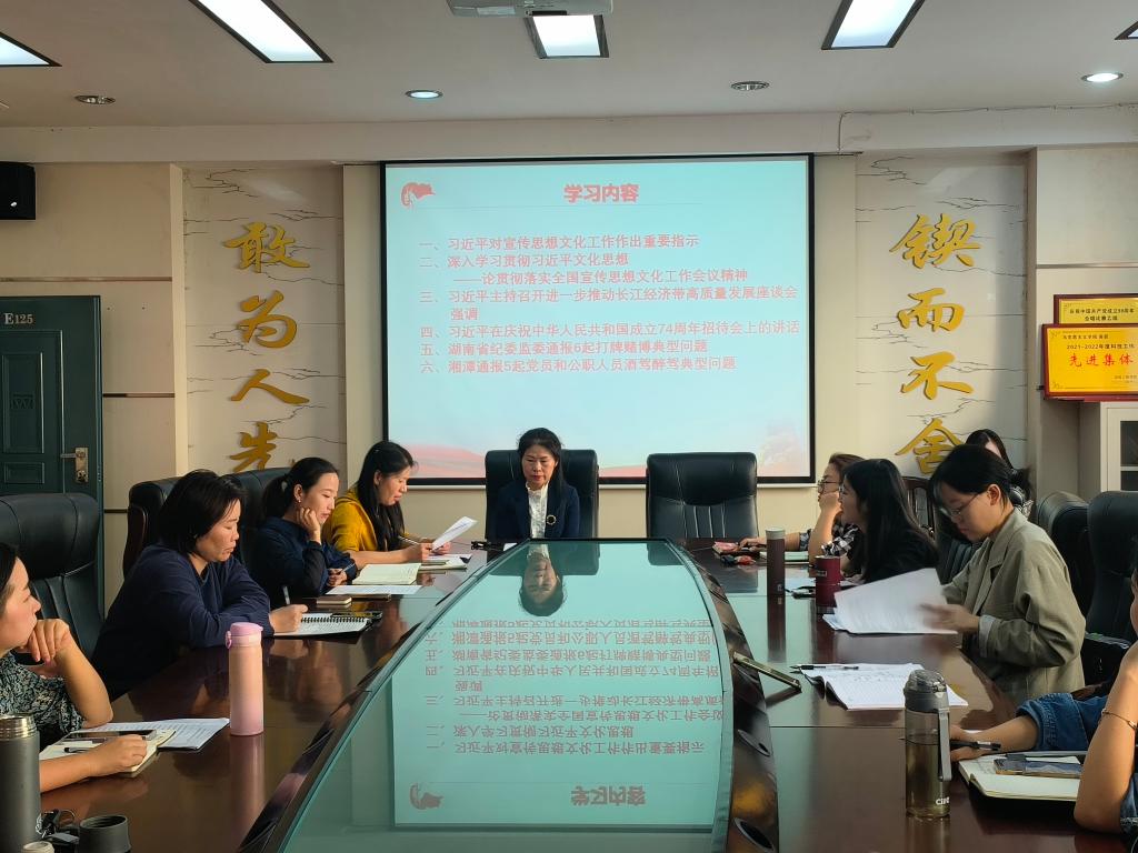 会议学习了《习近平对宣传思想文化工作作出重要指示》《深入学习贯彻习近平文化思想——论贯彻落实全国宣传思想文化工作会议精神》《习近平主持召开进一步推动长江经济带高质量发展座谈会强调》《习近平在庆祝中华人民共和国成立74周年招待会上的讲话》以及《湖南省纪委监委通报6起打牌赌博典型问题》和《湘潭通报5起党员和公职人员酒驾醉驾典型问题》。
