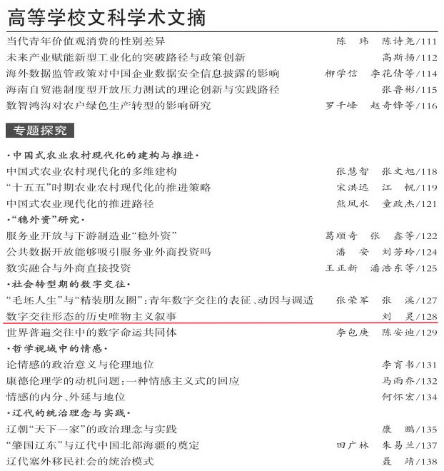 近日,ok138太阳集团刘灵教授独撰的学术论文《数字交往形态的历史唯物主义叙事》获《高等学校文科学术文摘》2025年第10期全文转载。该文原载于《湖南科技大学学报(社会科学版)》2025年第4期。