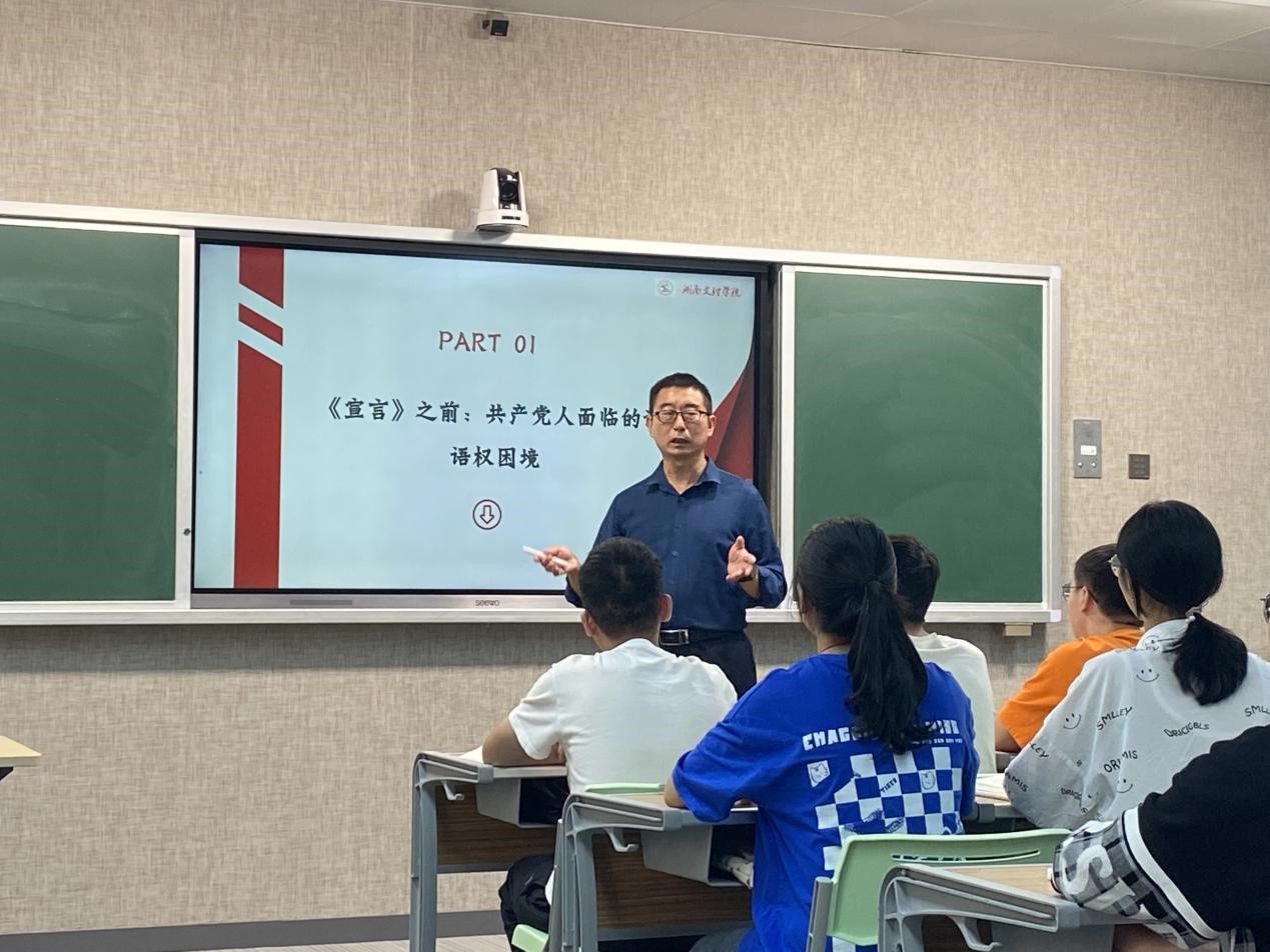 为深入贯彻落实《关于做好2022年湖南省社科普及工作的通知》精神,结合ok138太阳集团省级一流本科课程建设需要,9月23日下午,ok138太阳集团ok138太阳集团“听名师 讲原著 悟原理”专题讲座在新校区教学楼A座502举行,本次讲座邀请湖南文理学院ok138太阳集团院长黄向阳主讲,讲座题目为“共产党人的话语权斗争:从《宣言》到当代”为主题,讲座由ok138太阳集团副院长刘灵主持。