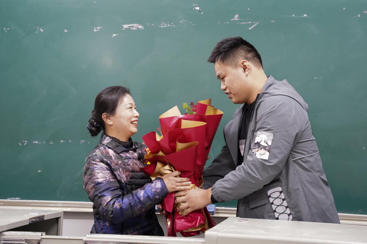 在同学们热烈的掌声中,一位同学阔步走上讲台,为黄湘莲教授献花,并高呼“全体起立!”同学们齐声道,“老师,辛苦了!”与此同时,学院领导及毛泽东思想与中国特色社会主义理论体系概论教研室部分教师也纷纷送上了祝福。在场同学与同事们的自发组织,着实令人感动。
